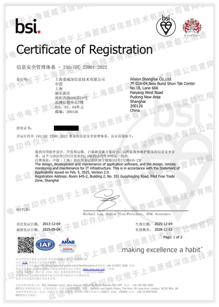 ISO/IEC 27001とは、情報セキュリティマネジメントシステムの国際規格であり、情報セキュリティの3つの要素(機密性Confidentiality+完全性Integrity+可用性Availability)がバランス良くマネジメントされ、リスクを適切に管理しているという信頼を利害関係者に与えるための枠組みが示されています。当社は 2005 年にISO/IEC 27001認証を初回取得し、2022年の更新に続き、今回で三度目の認証更新を2025年年内に完了しました。本認証により、当社の情報セキュリティマネジメントシステムが当規格に適合し、ネットワークセキュリティ・プライバシー保護等の核心要求事項を強化されていることが確認されました。